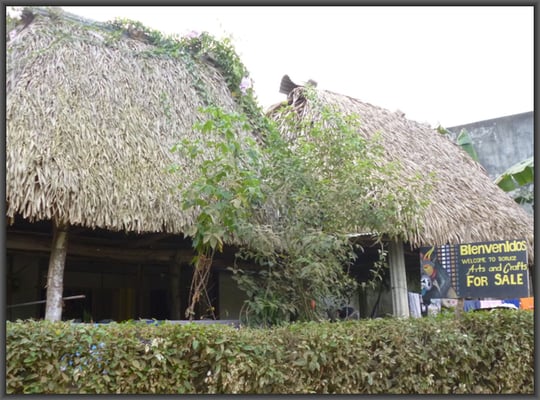 See the photos below, times have changed in the village, the road in the town center is now paved, and the environmental branch of the government will not longer let them cut palm leaves for the roofs of the houses. Marinas is now shiny metal, but still has the thatched roof over her gift shop. The second row of photos show the stone sphere at the museum , the sign at the parking area on the right, and Marina's house with new roof.